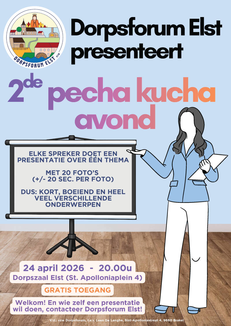 Pecha Kucha, wat is dat voor iets, denkt u? Wel, Pecha Kucha is een Japans concept (20 x 20), dat ondertussen de wereld heeft veroverd (zie https://www.pechakucha.com/). Er gingen reeds Pecha Kucha-avonden door in alle wereldsteden (Tokio, New York, Brussel, …) maar ook… in ons eigenste dorpje Elst (op 5 juni 2011). Vijftien jaar later vinden we het wel eens tijd voor een tweede Pecha Kucha avond.